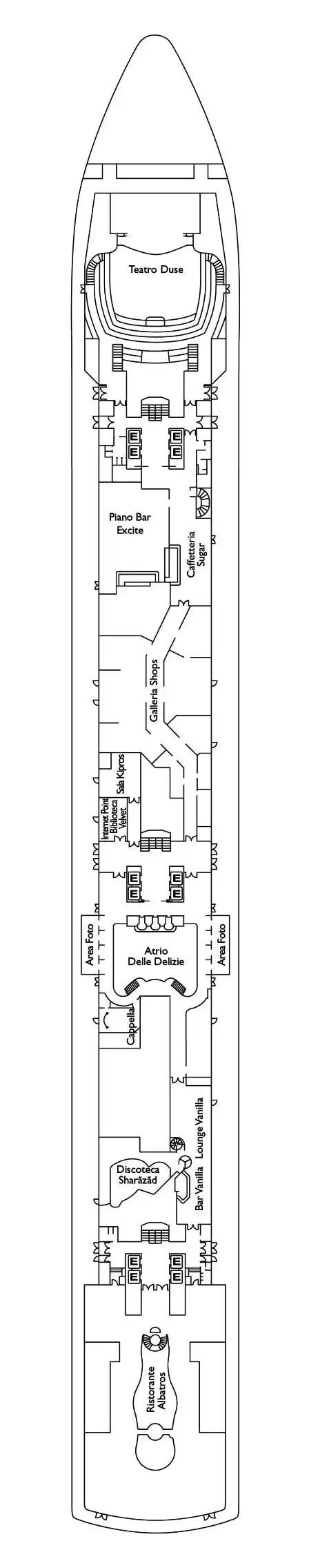 vari ristoranti e bar dove poter passare una piacevole serata con musica dal vivo. Per gli amanti dell’arte imperdibile è la “Sfera” di Arnaldo Pomodoro, scultura originale presente a bordo.