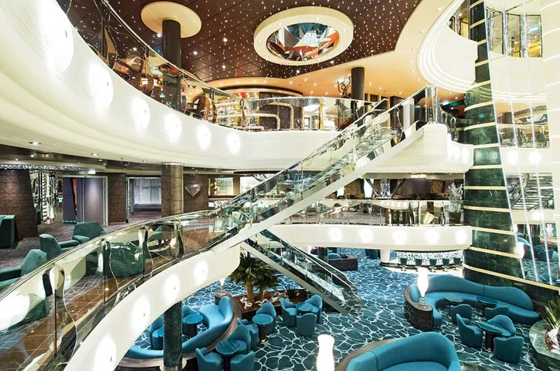 Gli interni a bordo di MSC Preziosa sono veramente ricercati e sorprendenti, come ad esempio la sinuosa scalinata in cristallo Swarovski che nell’atrio principale della nave luccica e risplende in tutto il suo sfarzo. A bordo inoltre si trova una piazza in vera pietra e 26 ascensori di cui 17 ad uso esclusivo dei passeggeri e 2 panoramici: l’occasione perfetta per ammirare il paesaggio mentre torni alla tua cabina.
